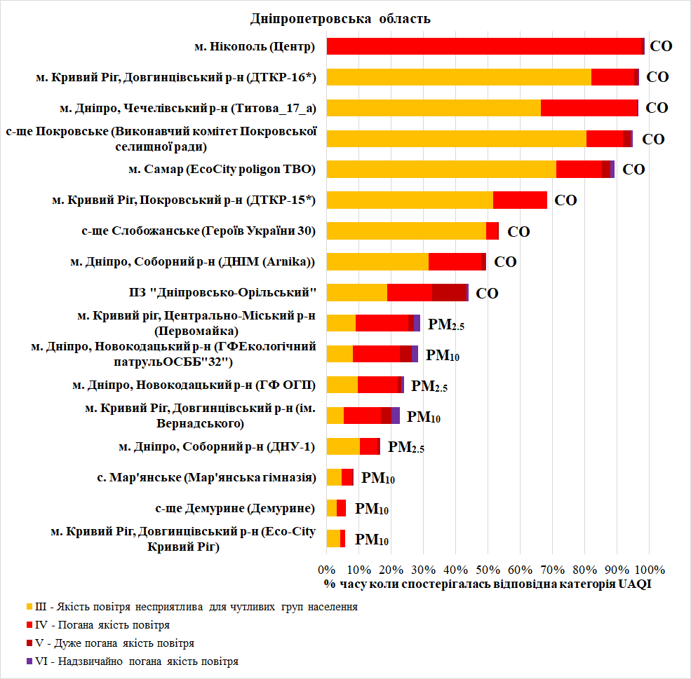 – оксид вуглецю (СО) – у Дніпрі, Кривому Розі, Самарі, Нікополі, с-ще Покровське, с-ще Слобожанське та на території Природного заповідника “Дніпровсько-Орільський”.