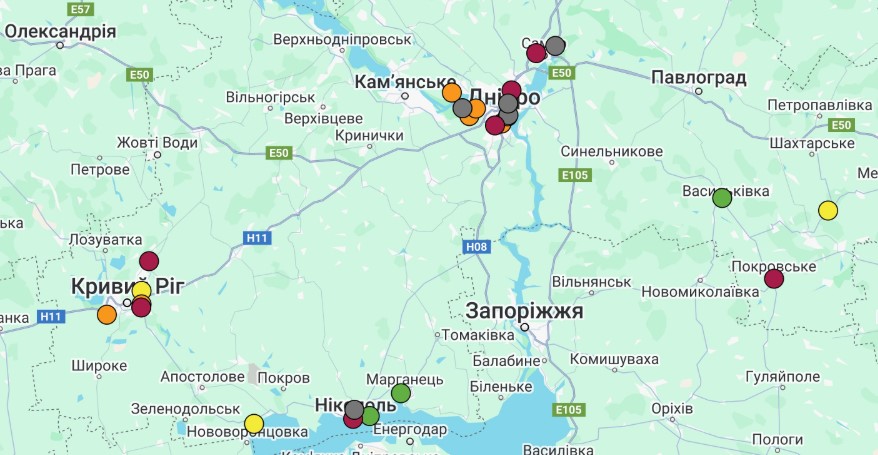 – дрібнодисперсний пил (PM2.5 та РМ10) – у Дніпрі, Кривому Розі, селищі Демурине та селі Мар’янське;