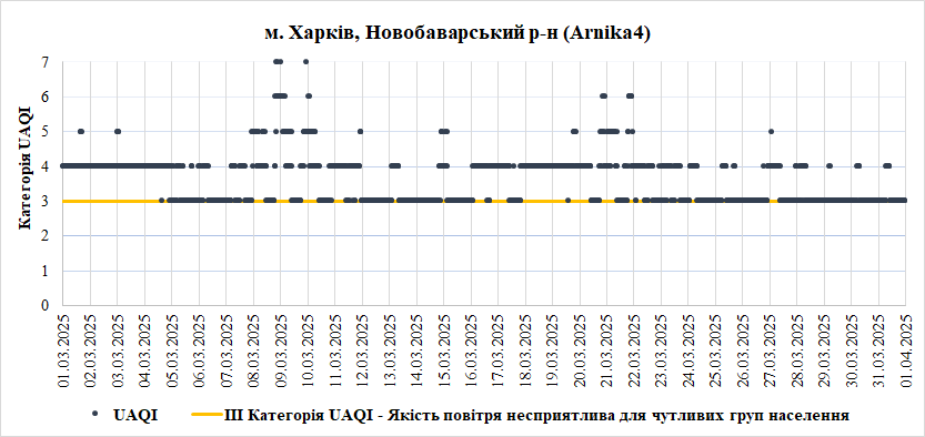 За березень ми аналізували дані з 7 станцій моніторингу розташованих у м. Харків (6 станцій) та селищі Пісочин (1 станція, яка виключена за аналізу через недостатню кількість даних).