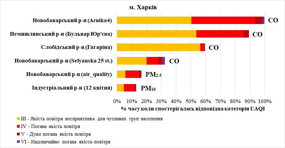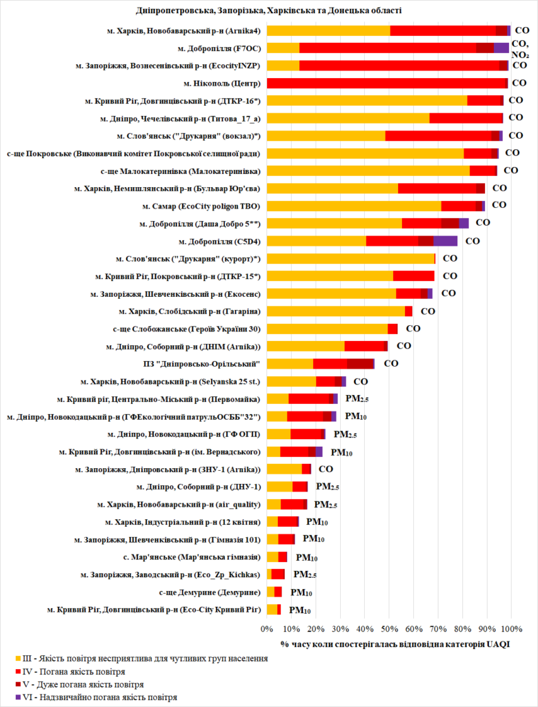 З усіх станцій які досліджувались були відібрані станції на яких спостерігалась несприятлива та погана якість повітря згідно UAQI (категорії якості повітря Ⅲ – Ⅵ). На графіку відображено % часу за місяць коли на станціях спостерігалась несприятлива та погана якість повітря згідно UAQI, а також, показники які найбільше вплинули на якість повітря (беруться показники, кількість значень категорії індексу Ⅲ та гірше яких >50%, якщо такого немає – декілька речовин, але не більше 3-х, які загалом складають > 70% від загальної кількості значень).