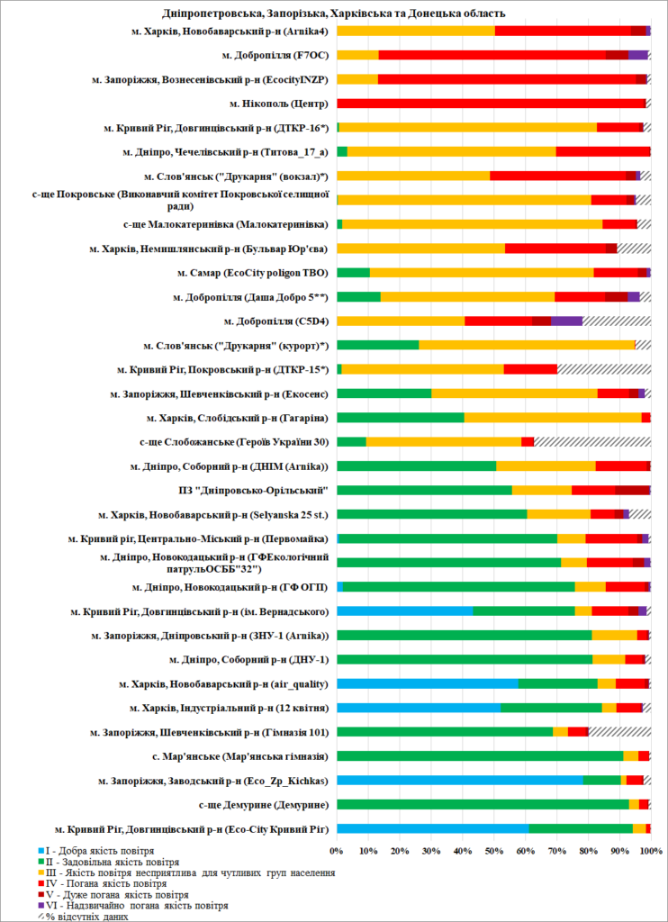 - м. Дніпро, Новокодацький р-н (ГФ ОГП «Екологічний патруль», Сухачівка) – 53% даних відсутні;