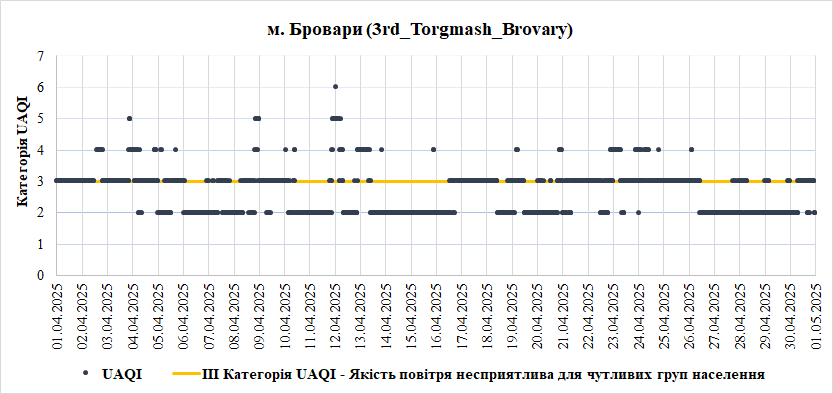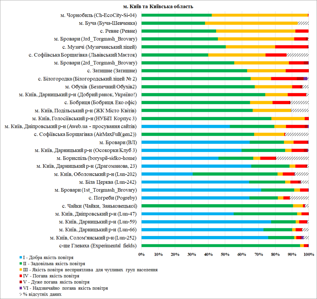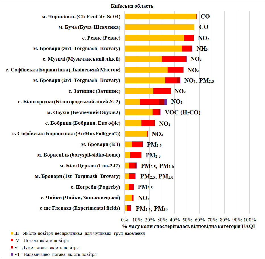 – діоксид азоту (NO₂) – у Броварах, с. Ревне, с. Бобриця, с. Музичі, с. Софіївській Борщагівці, с. Затишне, с. Чайки та с. Білогородка.