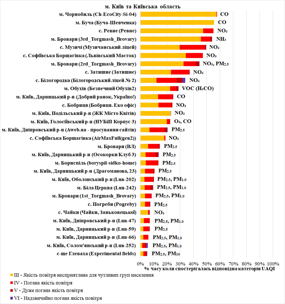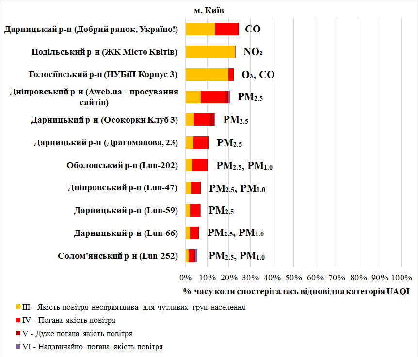 З усіх станцій які досліджувались були відібрані станції на яких спостерігалась несприятлива та погана якість повітря згідно UAQI (категорії якості повітря Ⅲ – Ⅵ). На графіку відображено % часу за місяць коли на станціях спостерігалась несприятлива та погана якість повітря згідно UAQI, а також, показники які найбільше вплинули на якість повітря (беруться показники, кількість значень категорії індексу Ⅲ та гірше яких >50%, якщо такого немає – декілька речовин, але не більше 3-х, які загалом складають> 70% від загальної кількості значень).