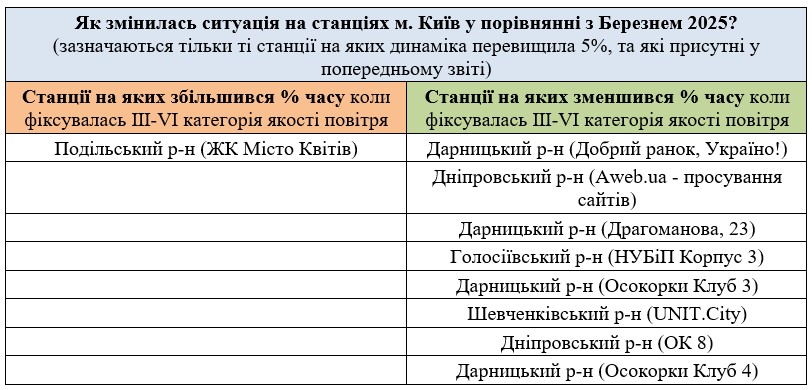 За квітень по Києву аналізувались дані з 28 станцій моніторингу відображених в мережі EcoCity, які розташовані у різних районах: