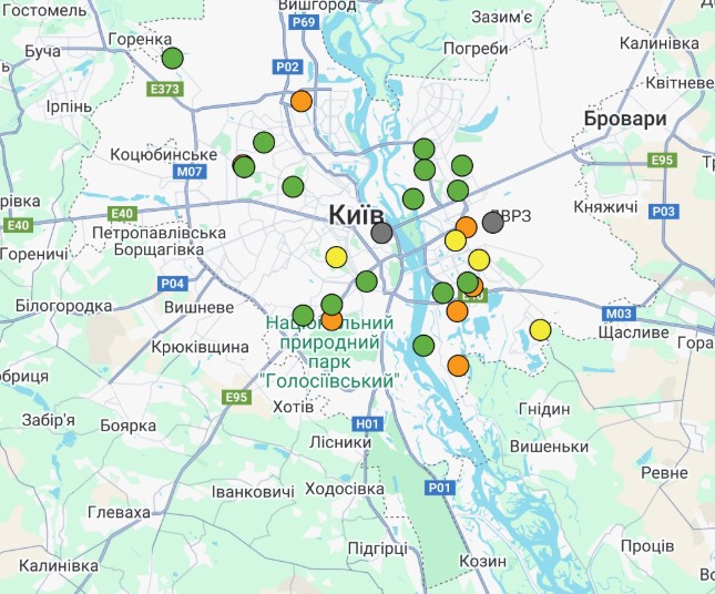 – дрібнодисперсний пил (РМ10, РМ2.5 та РМ1.0) – у Броварах, Борисполі, Білій Церкві, с. Погреби та селищі Глеваха;