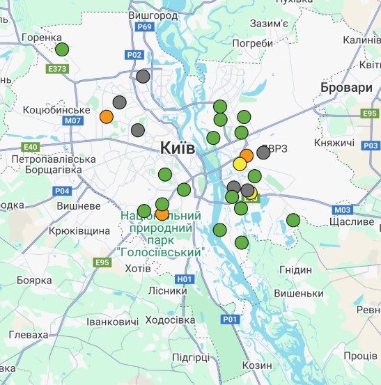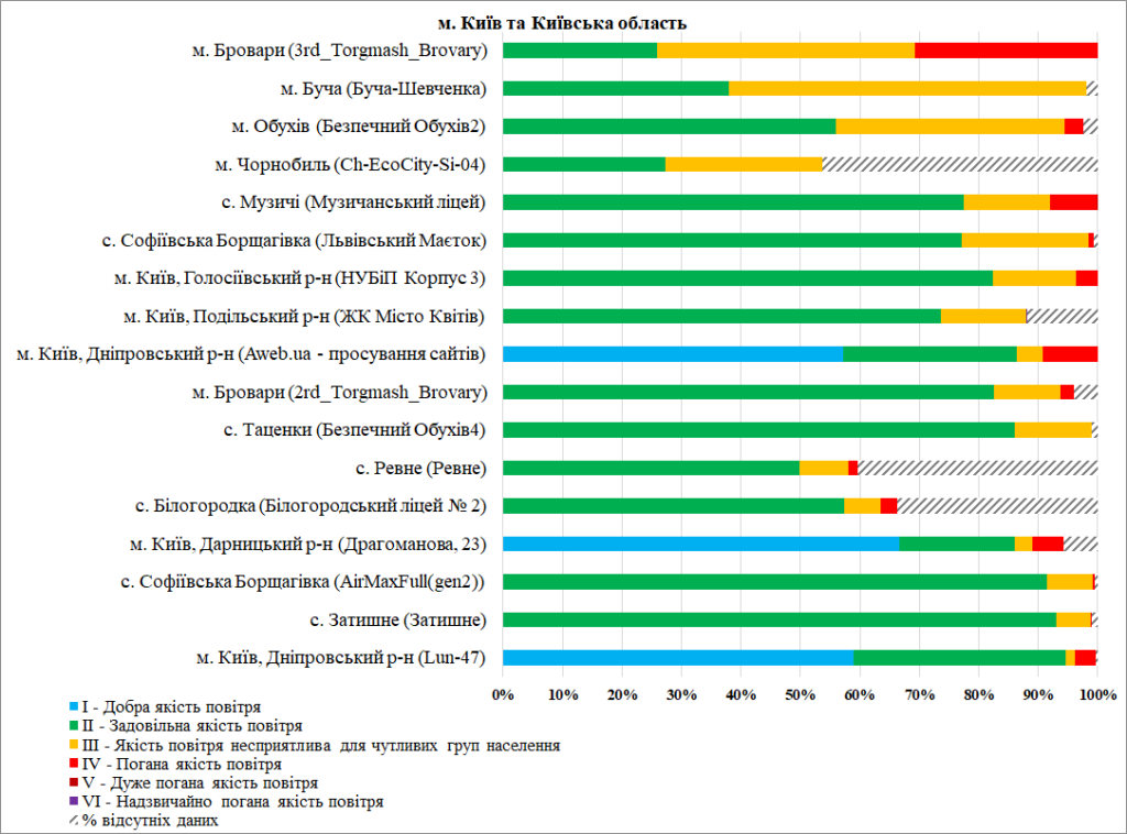(по кольорах: зелений – переважно добра та задовільна якість повітря, незадовільна якість повітря становить <5%; жовтий – % часу за місяць коли категорія якості повітря Ⅲ та гірше становить 5% -10%; помаранчевий – 10% – 50%; бордовий – >50% часу за місяць; сірий – недостатньо даних (наявно <50% даних від загальної кількості за місяць)