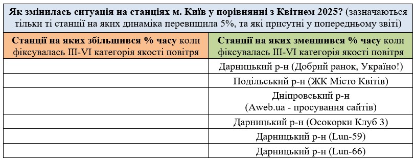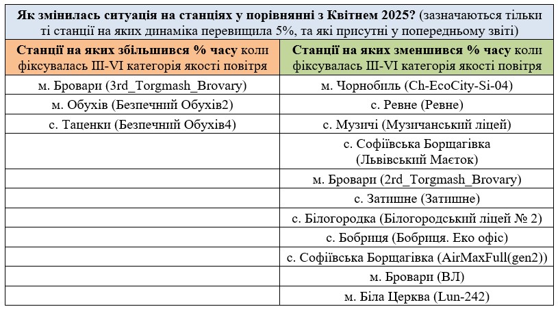 Станції на яких несприятлива та погана якість повітря спостерігалась більше ніж 5% часу за місяць: