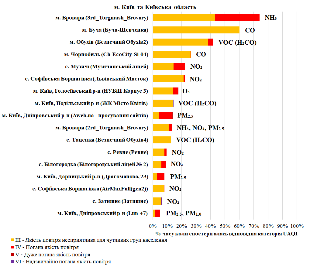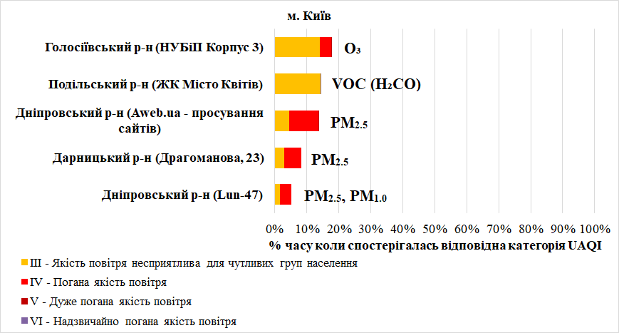 З усіх станцій які досліджувались були відібрані станції на яких спостерігалась несприятлива та погана якість повітря згідно UAQI (категорії якості повітря Ⅲ – Ⅵ). На графіку відображено % часу за місяць коли на станціях спостерігалась несприятлива та погана якість повітря згідно UAQI, а також, показники які найбільше вплинули на якість повітря (беруться показники, кількість значень категорії індексу Ⅲ та гірше яких >50%, якщо такого немає – декілька речовин, але не більше 3-х, які загалом складають> 70% від загальної кількості значень).
