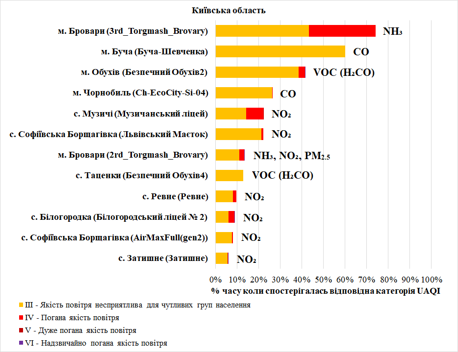 – діоксид азоту (NO₂) – у Броварах, с. Музичі, с. Софіївській Борщагівці, с. Ревне, с. Затишне та с. Білогородка.