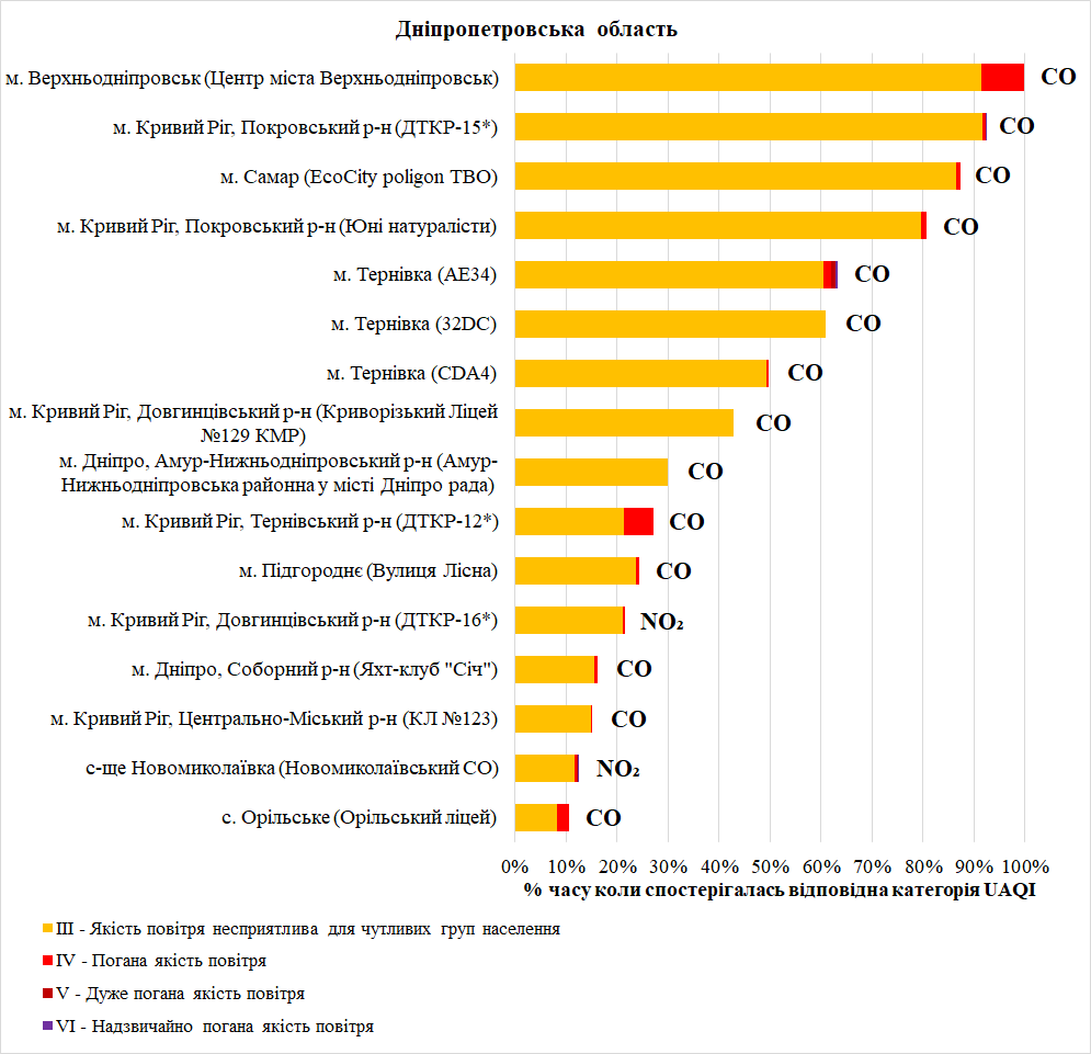– оксид вуглецю (СО) – у Верхньодніпровську, Дніпрі, Кривому Розі, Самарі, Тернівці, Підгородньому та с. Орільське;