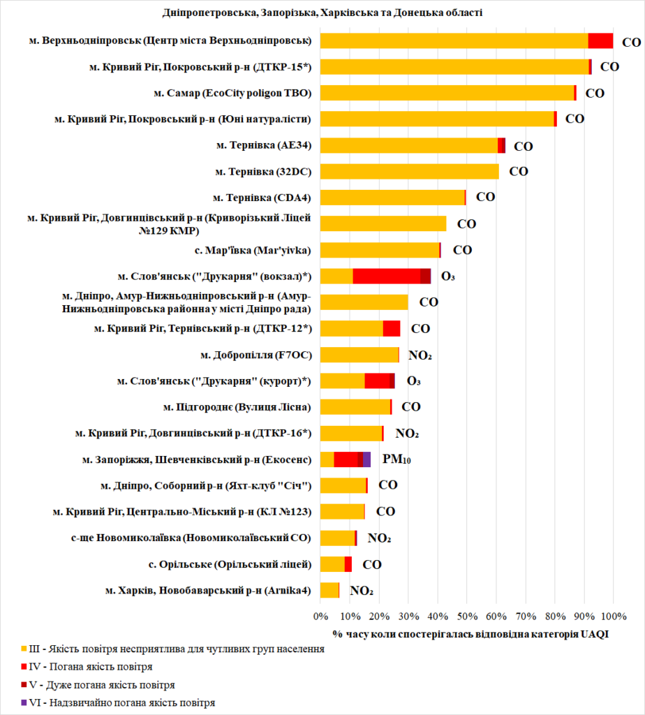 З усіх станцій які досліджувались були відібрані станції на яких спостерігалась несприятлива та погана якість повітря згідно UAQI (категорії якості повітря Ⅲ – Ⅵ). На графіку відображено % часу за місяць коли на станціях спостерігалась несприятлива та погана якість повітря згідно UAQI, а також, показники які найбільше вплинули на якість повітря (беруться показники, кількість значень категорії індексу Ⅲ та гірше яких >50%, якщо такого немає – декілька речовин, але не більше 3-х, які загалом складають > 70% від загальної кількості значень).