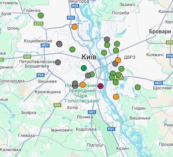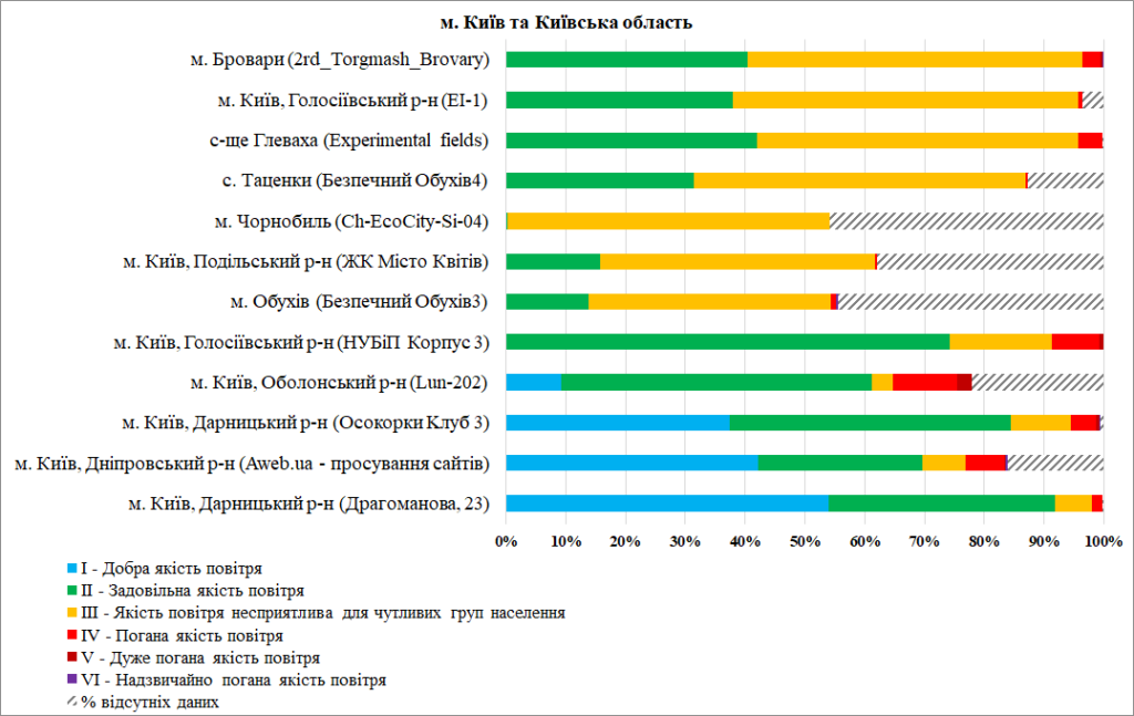 (по кольорах: зелений – переважно добра та задовільна якість повітря, незадовільна якість повітря становить <5%; жовтий – % часу за місяць коли категорія якості повітря Ⅲ та гірше становить 5% -10%; помаранчевий – 10% – 50%; бордовий – >50% часу за місяць; сірий – недостатньо даних (наявно <50% даних від загальної кількості за місяць)