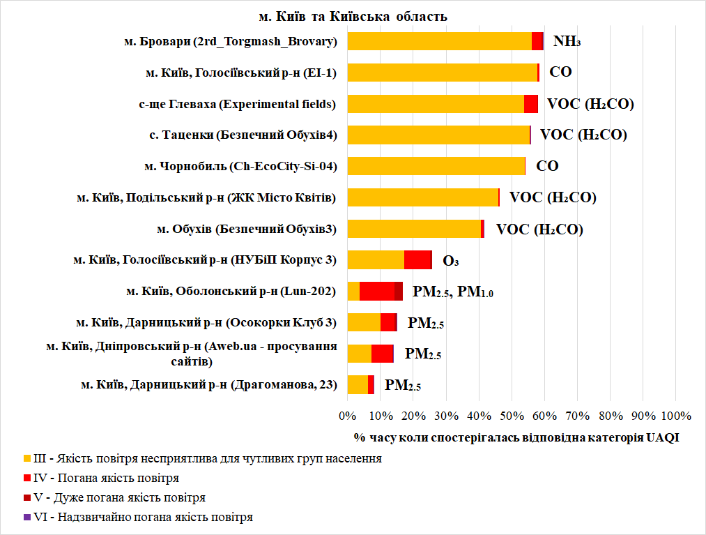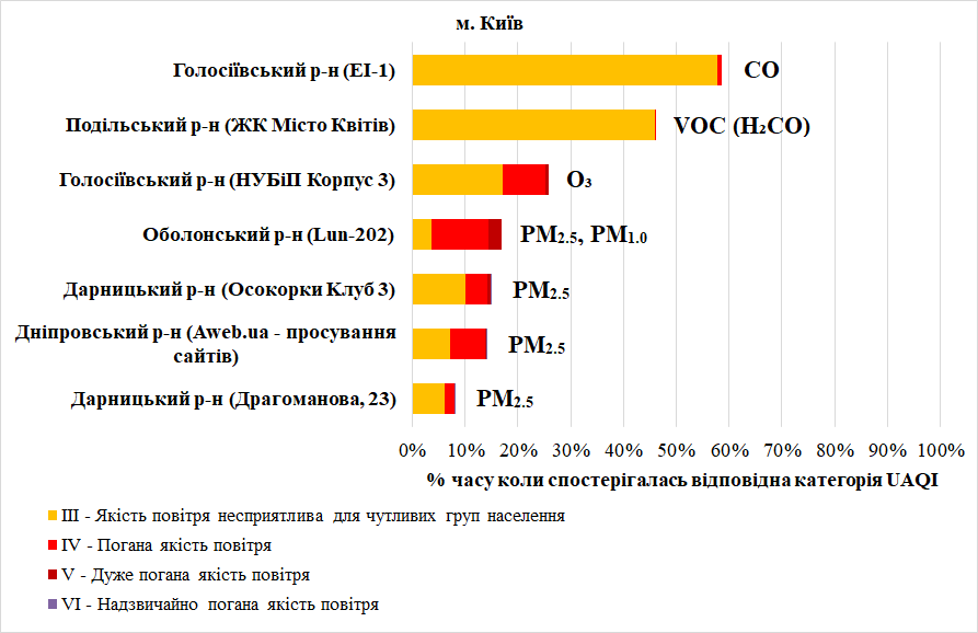 З усіх станцій які досліджувались були відібрані станції на яких спостерігалась несприятлива та погана якість повітря згідно UAQI (категорії якості повітря Ⅲ – Ⅵ). На графіку відображено % часу за місяць коли на станціях спостерігалась несприятлива та погана якість повітря згідно UAQI, а також, показники які найбільше вплинули на якість повітря (беруться показники, кількість значень категорії індексу Ⅲ та гірше яких >50%, якщо такого немає – декілька речовин, але не більше 3-х, які загалом складають> 70% від загальної кількості значень).