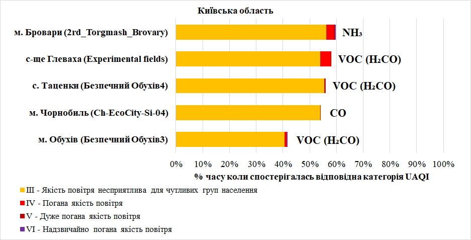 – VOC (H₂CO) – сума летких органічних сполук (включно з леткими органічними сполуками у перерахунку на формальдегід) – в Обухові, с. Таценки та поблизу селища Глеваха.