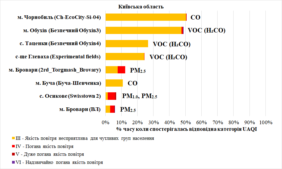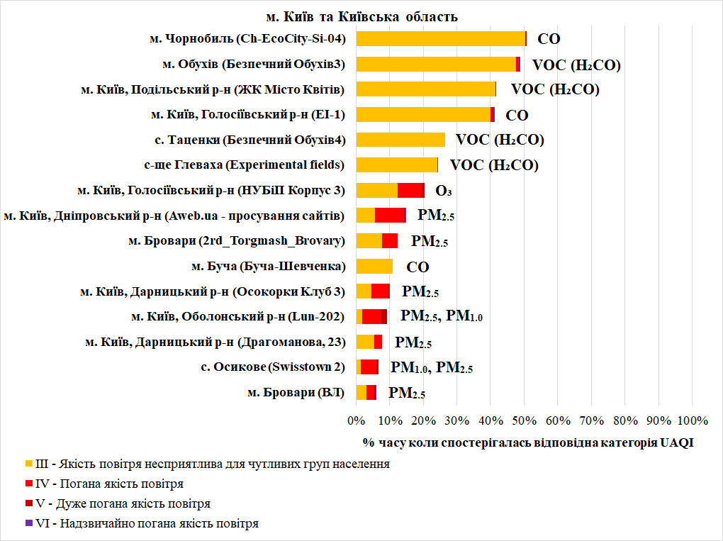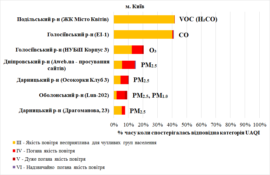 З усіх станцій які досліджувались були відібрані станції на яких спостерігалась несприятлива та погана якість повітря згідно UAQI (категорії якості повітря Ⅲ – Ⅵ). На графіку відображено % часу за місяць коли на станціях спостерігалась несприятлива та погана якість повітря згідно UAQI, а також, показники які найбільше вплинули на якість повітря (беруться показники, кількість значень категорії індексу Ⅲ та гірше яких >50%, якщо такого немає – декілька речовин, але не більше 3-х, які загалом складають> 70% від загальної кількості значень).