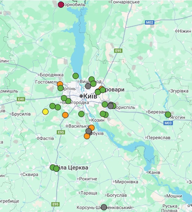 На всіх станціях за місяць показник гамма радіації (потужності експозиційної дози гамма-випромінювання) коливався переважно в межах 1,0 – 27,9 мкР/год (uR/h), що відповідає природному фону та не становить загрози. На станції «EI-1» (Голосіївський р-н) за місяць декілька разів фіксувались аномальні перевищення допустимого рівня, що потребують подальшого спостереження та за можливості додаткових досліджень. Допустиме значення рівня радіаційного фону згідно Норм радіаційної безпеки України (НРБУ-97) – 30 мкР/год.
