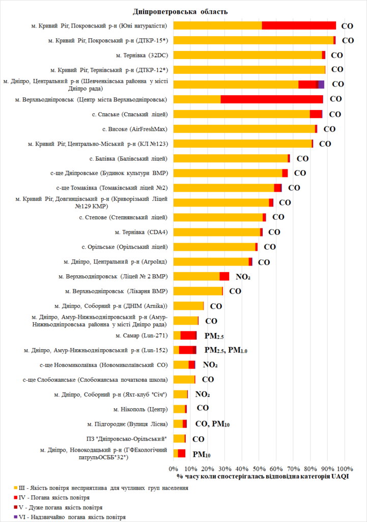 – оксид вуглецю (СО) – у м. Кривий Ріг, м. Верхньодніпровськ, м. Дніпро, м. Нікополь, м. Тернівка, м. Підгороднє, с. Спаське, с. Високе, с. Балівка, с-щі Дніпровське, с-щі Томаківка, с. Степове, с. Орільське, с-щі Слобожанське та на території ПЗ “Дніпровсько-Орільський”;
