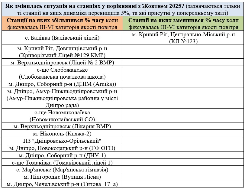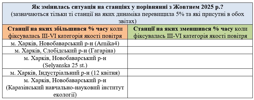 Станції на яких ситуація погіршилась – % часу за місяць коли спостерігалась незадовільна та погана якість повітря збільшився більше ніж на 5%: