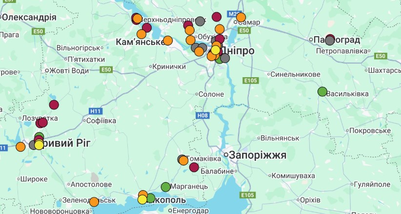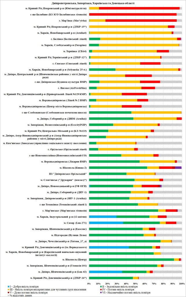 - м. Дніпро, Новокодацький р-н (ГФ ОГП «Екологічний патруль», Сухачівка) – 72% даних відсутні;