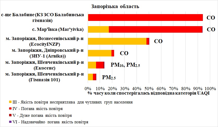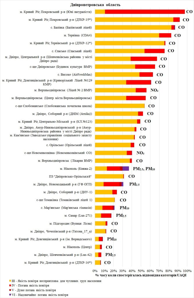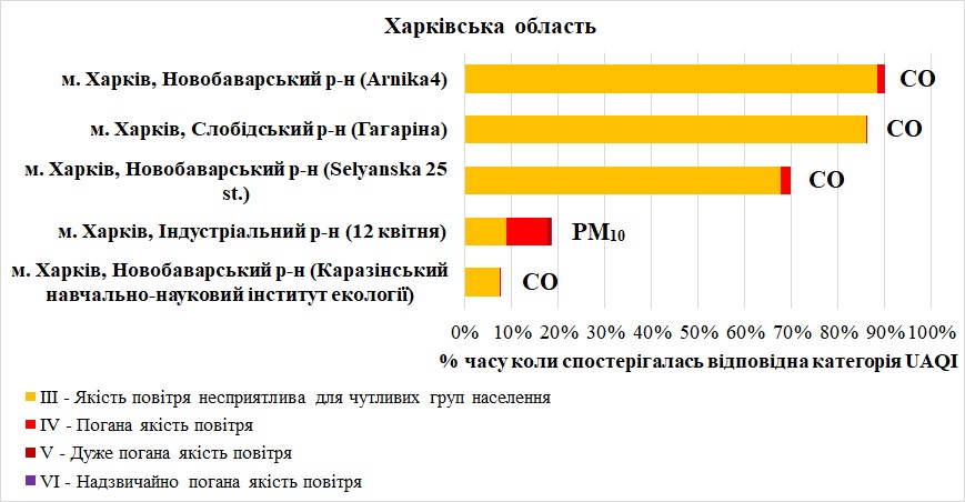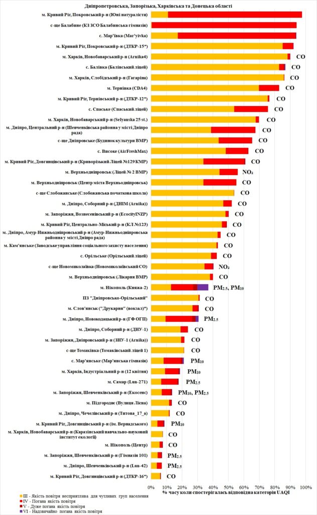 З усіх станцій які досліджувались були відібрані станції на яких спостерігалась несприятлива та погана якість повітря згідно UAQI (категорії якості повітря Ⅲ – Ⅵ). На графіку відображено % часу за місяць коли на станціях спостерігалась несприятлива та погана якість повітря згідно UAQI, а також, показники які найбільше вплинули на якість повітря (беруться показники, кількість значень категорії індексу Ⅲ та гірше яких >50%, якщо такого немає – декілька речовин, але не більше 3-х, які загалом складають > 70% від загальної кількості значень.