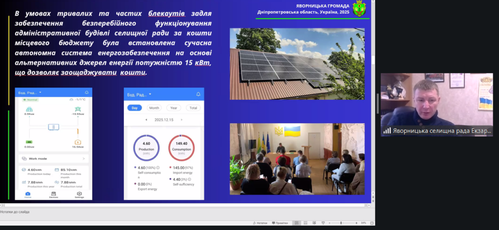 Першим спікером став Дмитро Екзархов, Яворницький селищний голова (Дніпропетровська область). Він поділився досвідом системного впровадження енергоефективних рішень і сонячної енергетики в громаді, яка сьогодні живе в умовах постійних енергетичних ризиків.