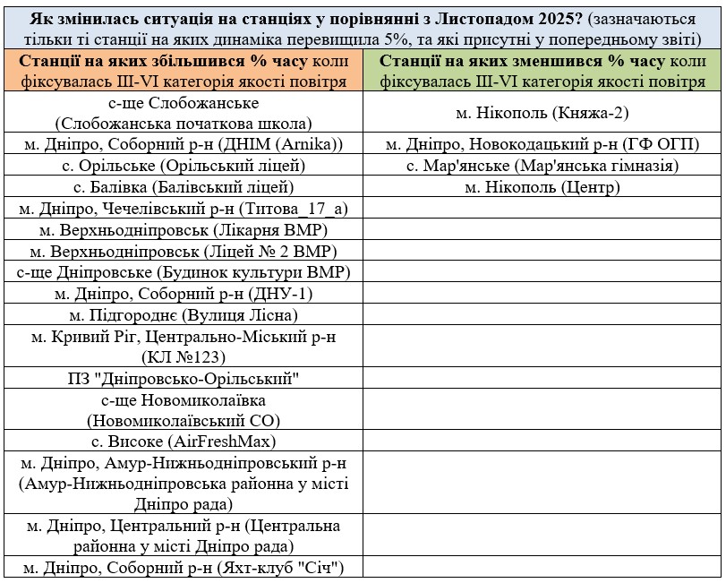 - м. Дніпро – 14 станцій (з яких 2 станції виключені з аналізу через недостатню кількість даних);