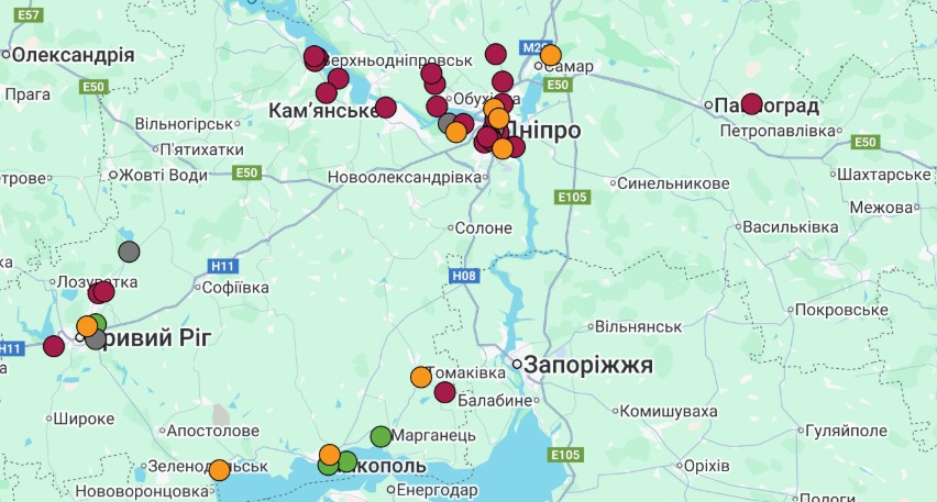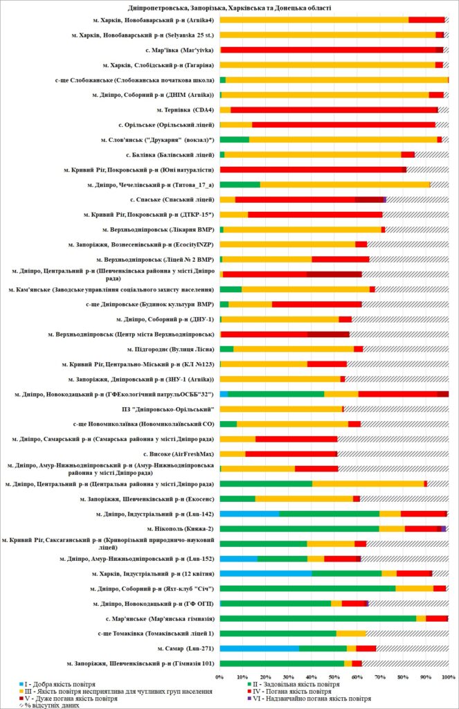 - м. Дніпро, Новокодацький р-н (ГФ ОГП «Екологічний патруль», Сухачівка) – 93% даних відсутні;