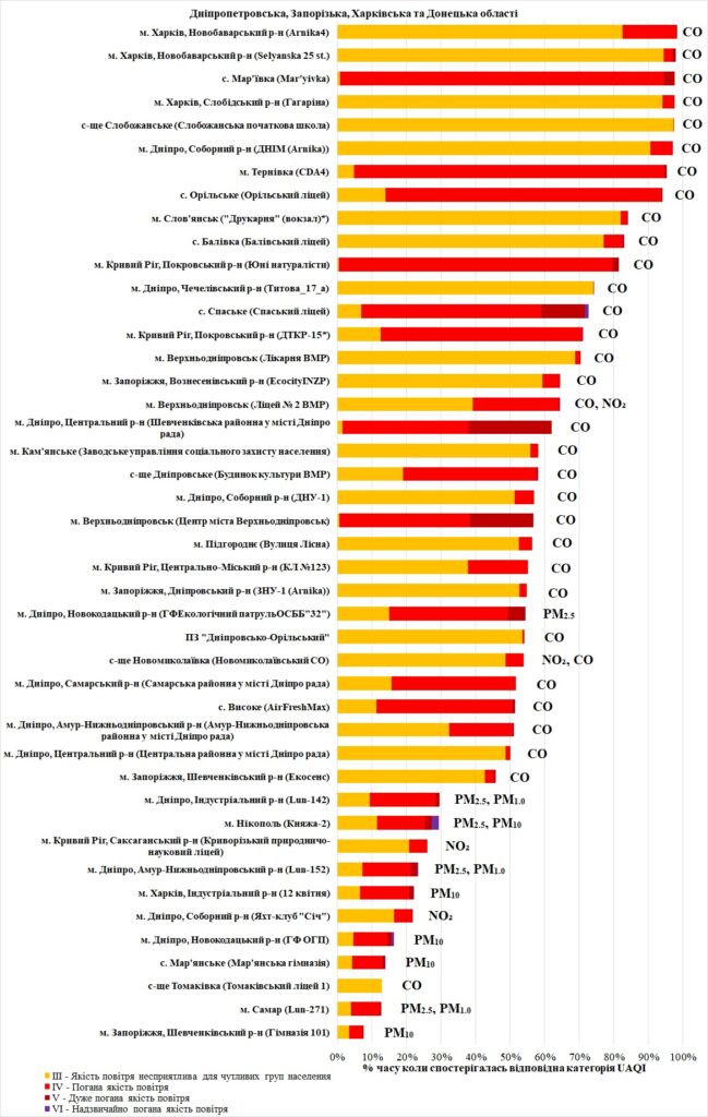 З усіх станцій які досліджувались були відібрані станції на яких спостерігалась несприятлива та погана якість повітря згідно UAQI (категорії якості повітря Ⅲ – Ⅵ). На графіку відображено % часу за місяць коли на станціях спостерігалась несприятлива та погана якість повітря згідно UAQI, а також, показники які найбільше вплинули на якість повітря (беруться показники, кількість значень категорії індексу Ⅲ та гірше яких >50%, якщо такого немає – декілька речовин, але не більше 3-х, які загалом складають > 70% від загальної кількості значень).