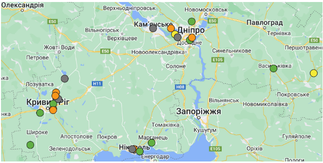 – дрібнодисперсний пил (PM2.5 та PM10у Дніпрі, Кривому Розі, Нікополі та смт Демурине;
