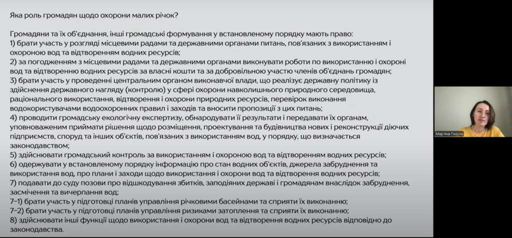 Вона продовжила тему, описавши реальний стан малих річок в Україні, їх деградацію під впливом сільського господарства, забудови й втрати природних заплав.