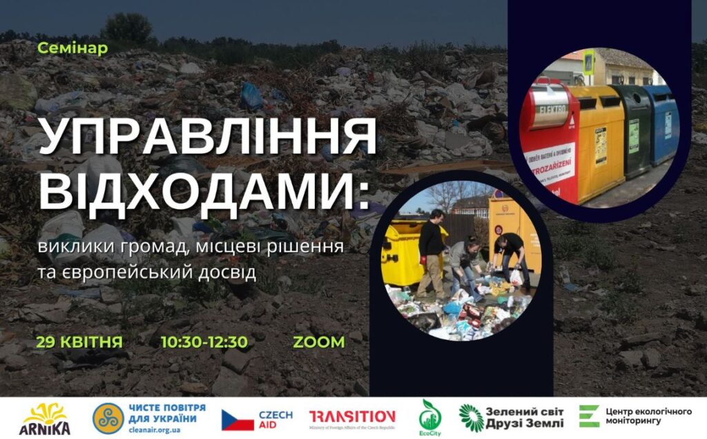 Програма «Чисте повітря для України» спільно з чеською неурядовою організацією «Арніка» (Чехія) запрошує вас до участі в онлайн-семінарі «Управління відходами: виклики громад, місцеві рішення та європейський досвід».